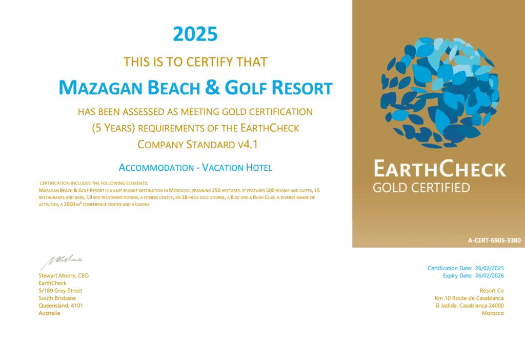 في انجاز غير مسبوق للقطاع الفندقي بالمغرب، تحصل منتجع مازاغان على شهادة “EarthCheck” الذهبية، وهي إحدى أبرز الشهادات العالمية في مجال السياحة المستدامة، مايعزز مكانته كرائد للسياحة البيئية.