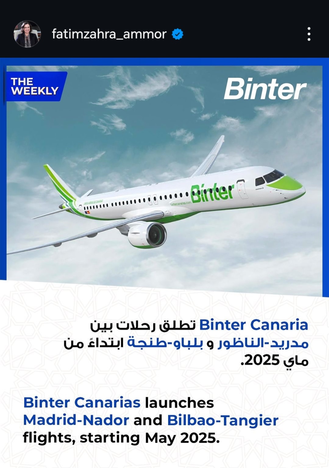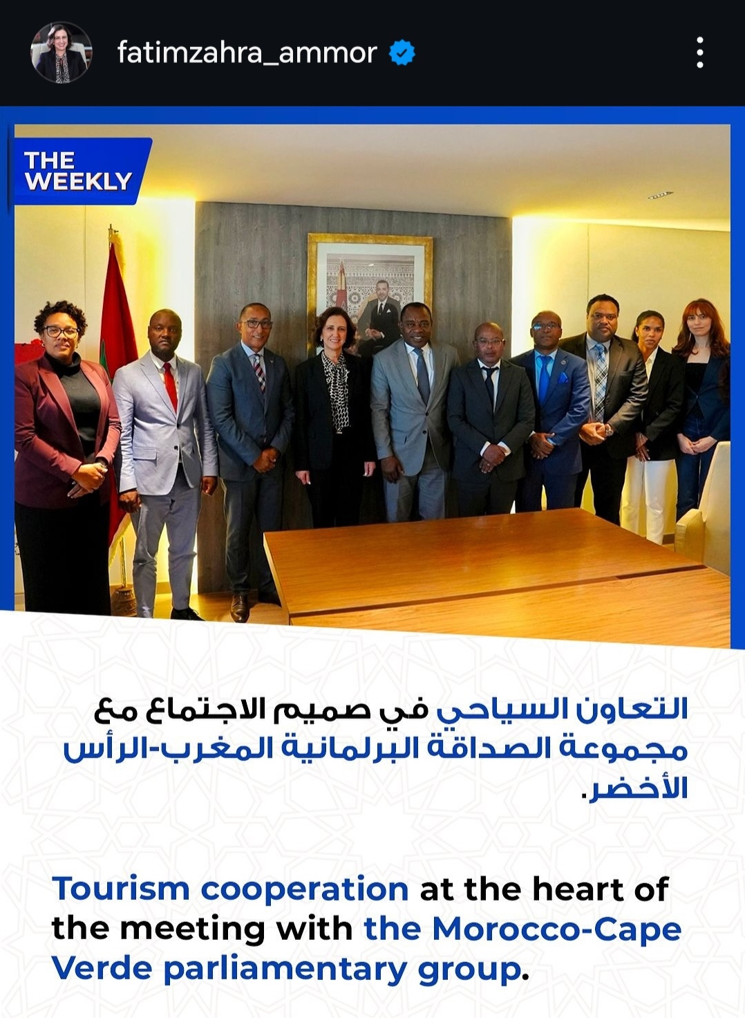 وفي السياق ذاته، أوضحت عمور، في صور أخرى، أن برنامج GO SIYAHA: تمت الموافقة على أكثر من 800 مشروع حتى الآن، مذكرة باجتماعها مع مجموعة الصداقة البرلمانية المغرب – الرأس الأخضر الذي كان موضوعه هو التعاون السياحي بين الطرفين، منتقلة إلى التحدث عن مذكرة التفاهم الجديدة بقيمة 30 مليون درهم التي تم توقيعها لتعزيز صادرات الصناعة التقليدية، ومختتمة الصور بالإعلان عن انطلاق الرحلات بين مدير الناظور وبلباو طنجة ابتداء من ماي 2025 عبر binter canaria.