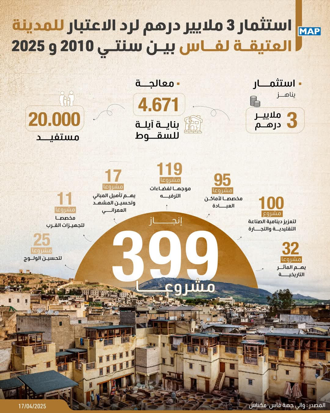 وفي معرض تقديمه حصيلة برامج تأهيل ورد الاعتبار للمدينة العتيقة لفاس، المُنجزة تحت إشراف الولاية والمنفذة من قبل وكالة التنمية ورد الاعتبار لمدينة فاس، أكد الوالي على تنوع مكونات هذه البرامج التي تهم، من بين أمور أخرى، 32 مشروعا يهم المآثر التاريخية و 100 مشروع لتعزيز دينامية الصناعة التقليدية والتجارة، و95 مشروعا مخصصا لأماكن العبادة، و119 مشروعا موجها لفضاءات الترفيه.