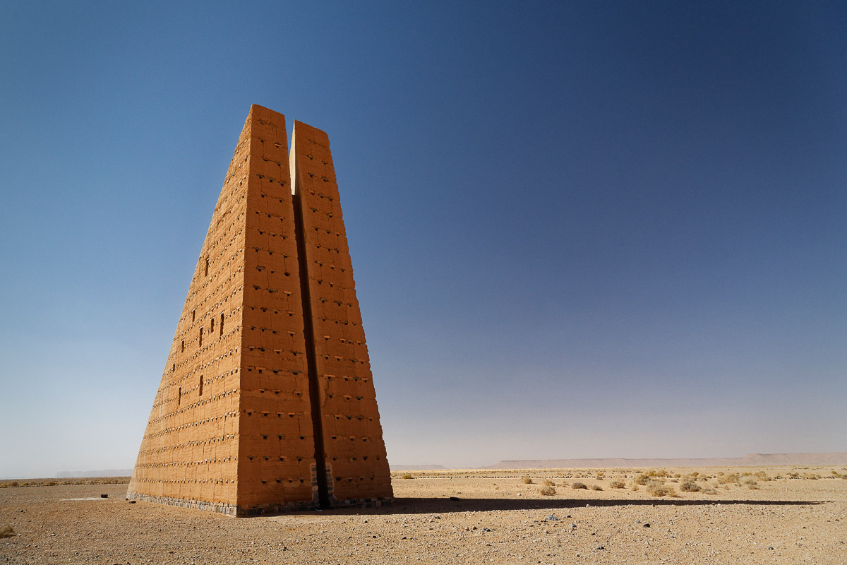 بُني على يد حرفيين محليين باستخدام تقنيات قديمة، من أساسات حجرية وجدران طينية بارتفاع 16 مترًا، يُلقي هذا المثلث القائم العملاق ظلًا على الأرض، ويستخدمه الرعاة أحيانًا للإحتماء من شمس الصحراء الحارقة، فهو الظل الوحيد في هذه المنطقة، يوجد بجوار النصب التذكاري بئر، وهو عبارة عن نسخة طبق الأصل من الخطارة.